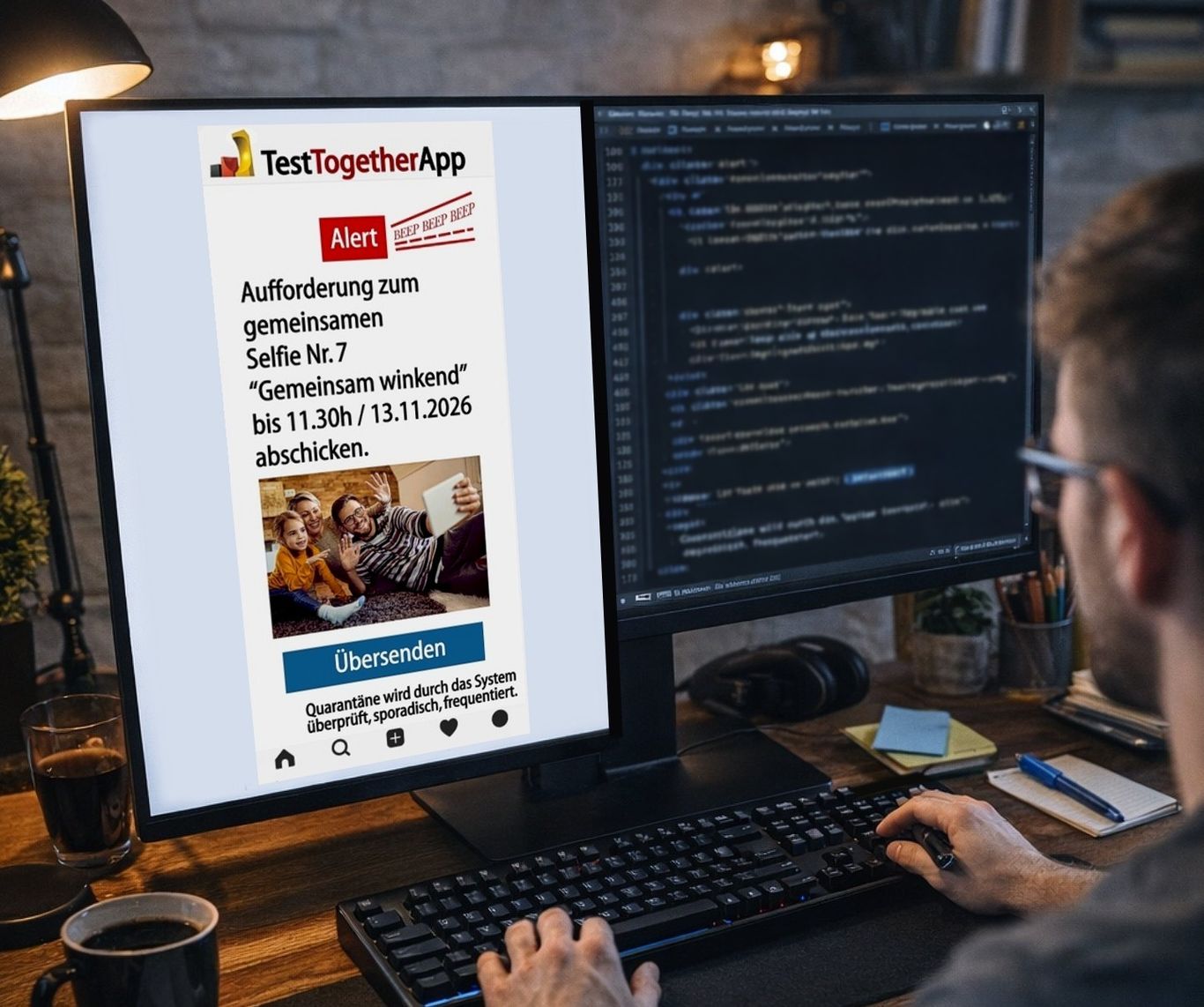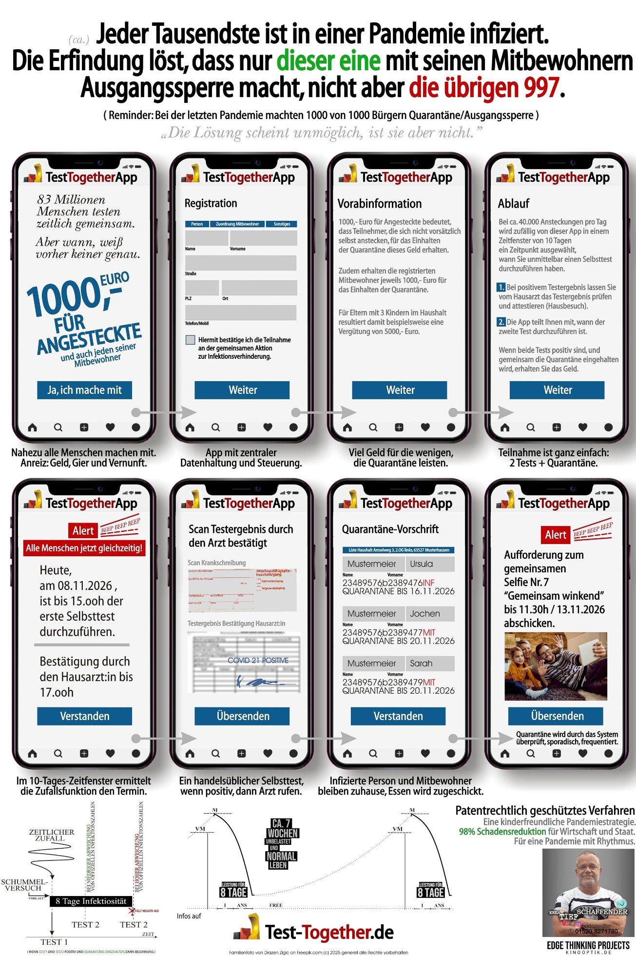 - Die Positivgetesteten müssen für den Erhalt der 1.000,- Euro 8 Tage Ausgangssperre samt der registrierten Mitbewohner durchführen. Dabei wird an der Wohnungstür eine Kennzeichnung zur Warnung anderer angebracht, die App fordert zudem dazu auf, gemeinsame themenbezogene Selfies zu machen, eine KI prüft diese Fotoergebnisse, ohne dass private Bilddaten gespeichert werden. Zudem findet über die Smartphones ein Geo-Tracking statt, dass zumindest "mit Smartphone" keiner das Haus verlässt.