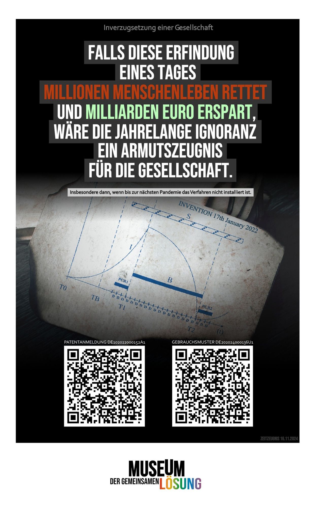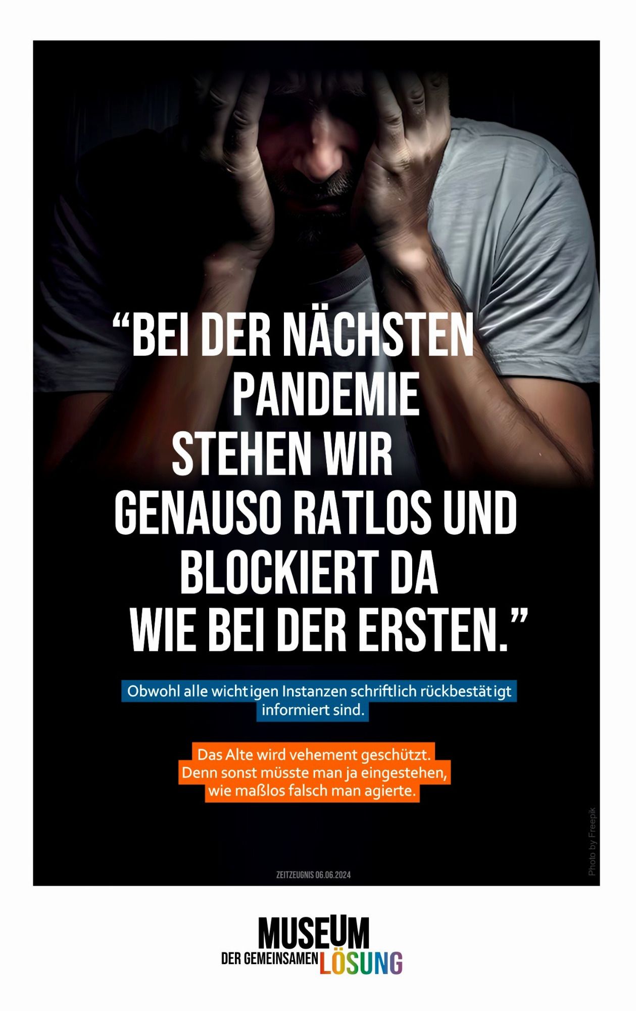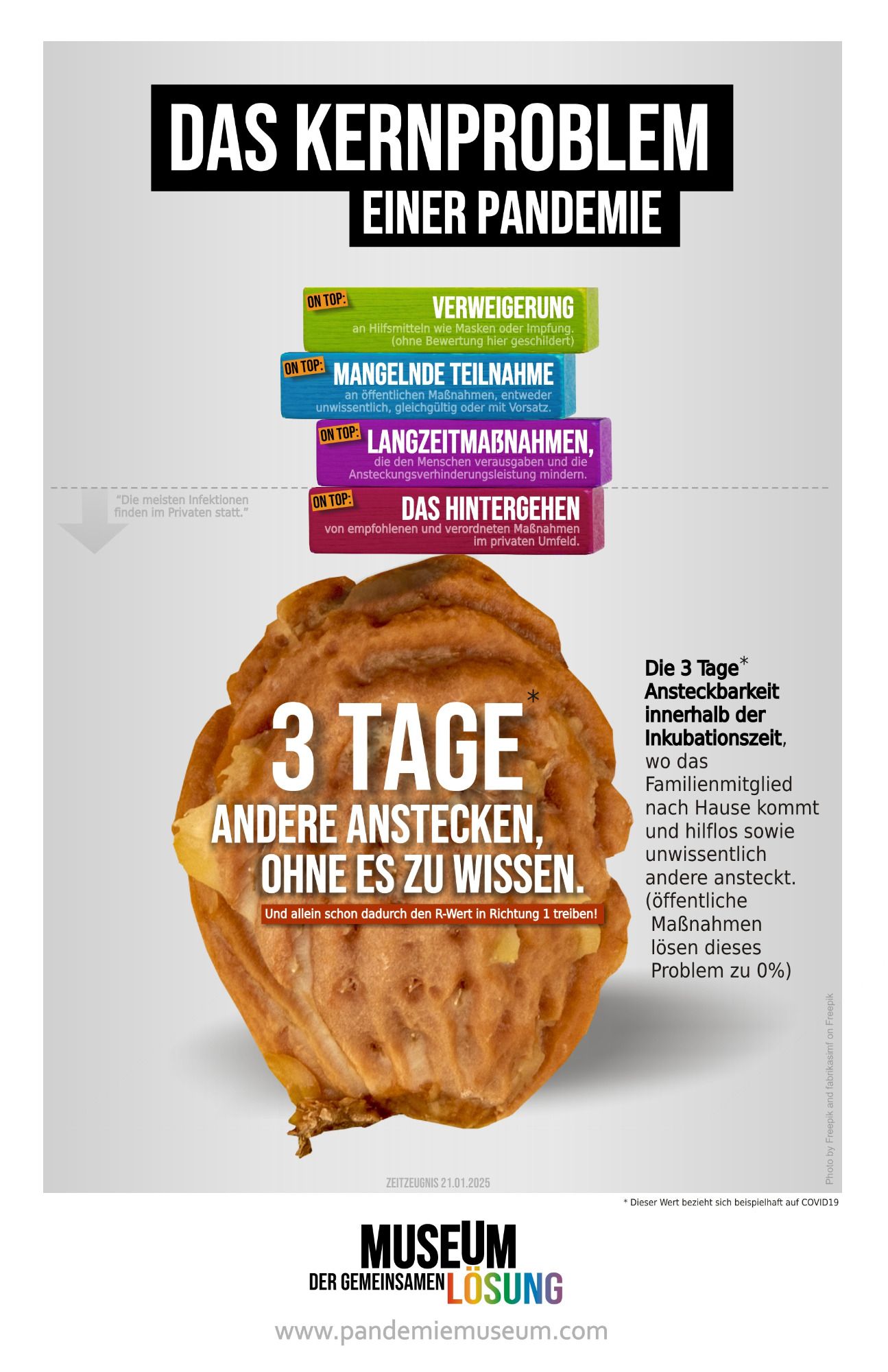 Im Vordergrund steht eine bessere Lösung für zukünftige Pandemien. Ärzt:innen, Pfleger:innen, Forscher:innen, tapfere Schüler:innen, Lehrer:innen u.v.m. leisteten Großartiges. Die Allgemeinheit jedoch - zu der ich mich als Verfasser auch zähle - erbrachte nicht annähernd die machbare Leistung. Wenn man sprichwörtlich 1:8 vom Platz geht, sollte man konkret daran arbeiten, beim nächsten Mal besser zu sein. Wir haben einen beträchtlichen Schiefstand beim Thema Pandemie. Bei öffentlichen Präsentationen meiner Arbeiten ergaben sich viele Dialoge. Für Menschen ist vordergründig: "Wie geht es mir selbst in einer Pandemie?" (Nicht "Wie schaffen wir es gemeinsam besser?"), "Pandemie ist, wenn ein gefährlicher Erreger angekündigt wird, aber gar nicht kommt" oder "Du bist zu spät mit Deinen Ideen, die Pandemie ist doch schon vorbei" (Ohne ein Gefühl für Vorsorge). Menschen (Erwachsene) sind nicht gut in Pandemie, und man hat den Eindruck, sie wollen auch schlecht darin bleiben. Wir Deutschen haben eine Pandemie mit 400 Milliarden Euro Schaden hingelegt, dafür gibt es alles andere als eine Bestnote.