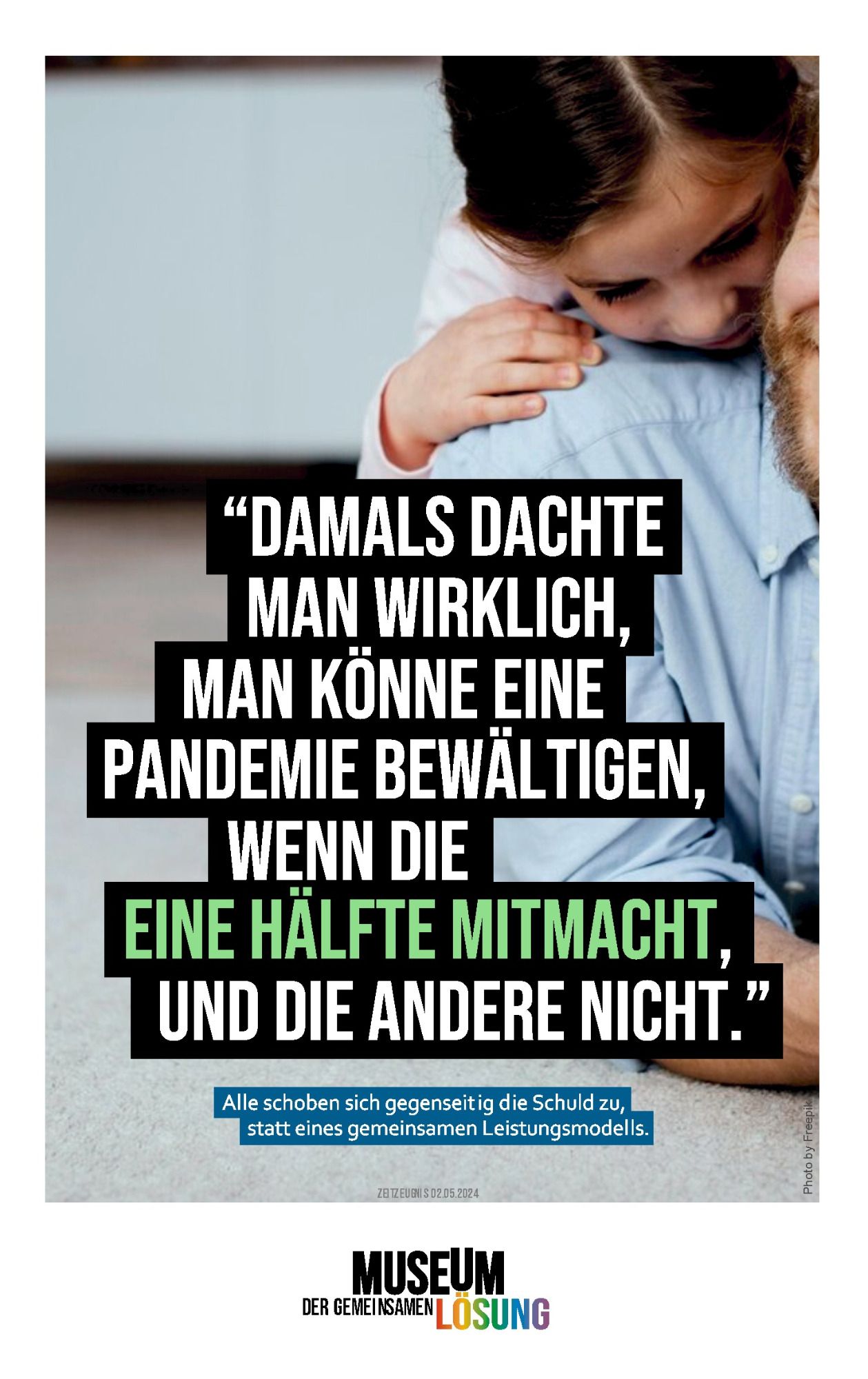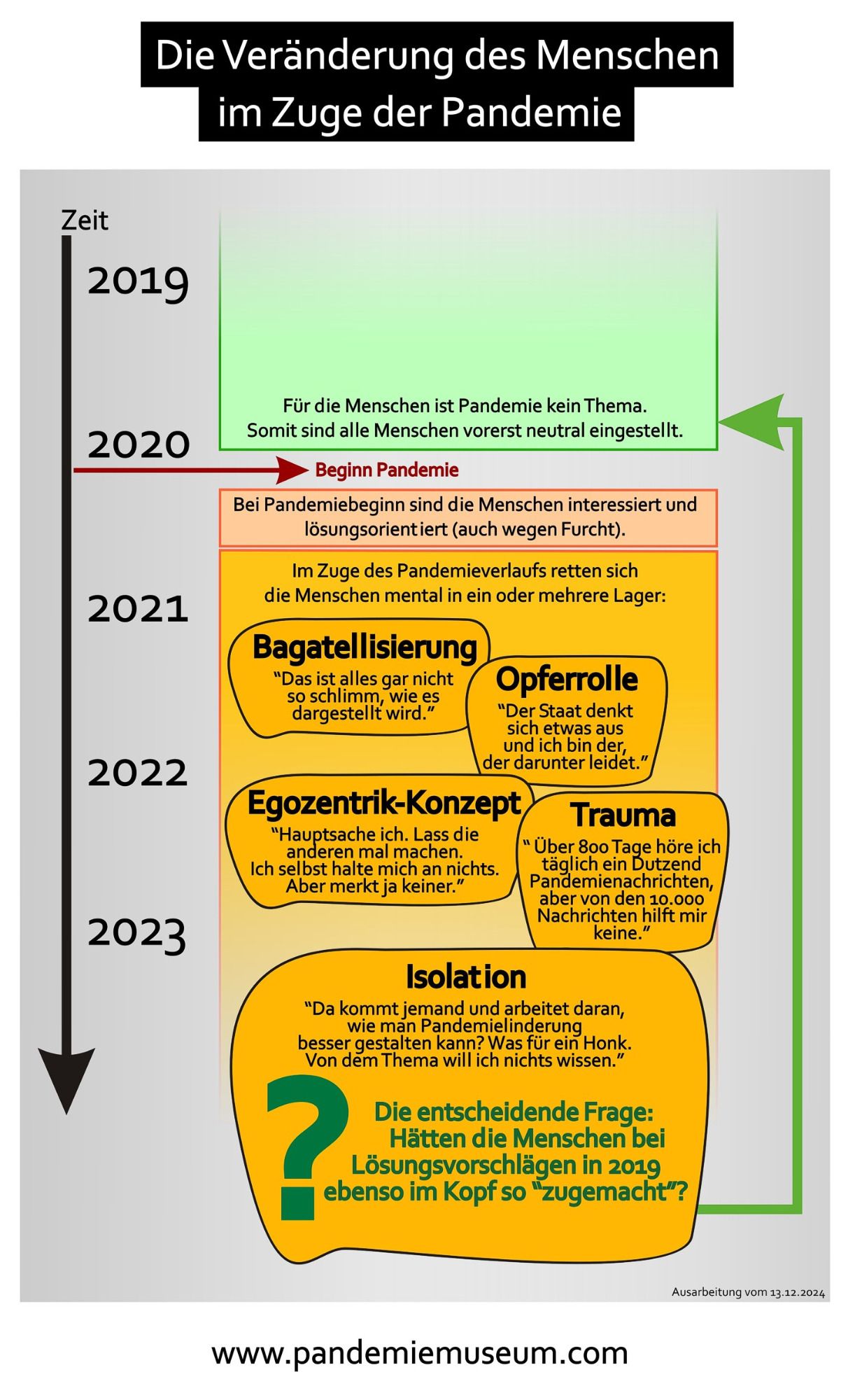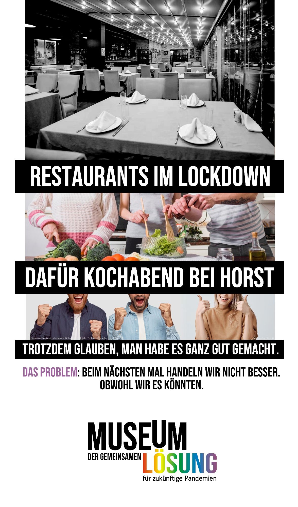 Im Vordergrund steht eine bessere Lösung für zukünftige Pandemien. Ärzt:innen, Pfleger:innen, Forscher:innen, tapfere Schüler:innen, Lehrer:innen u.v.m. leisteten Großartiges. Die Allgemeinheit jedoch - zu der ich mich als Verfasser auch zähle - erbrachte nicht annähernd die machbare Leistung. Wenn man sprichwörtlich 1:8 vom Platz geht, sollte man konkret daran arbeiten, beim nächsten Mal besser zu sein. Wir haben einen beträchtlichen Schiefstand beim Thema Pandemie. Bei öffentlichen Präsentationen meiner Arbeiten ergaben sich viele Dialoge. Für Menschen ist vordergründig: "Wie geht es mir selbst in einer Pandemie?" (Nicht "Wie schaffen wir es gemeinsam besser?"), "Pandemie ist, wenn ein gefährlicher Erreger angekündigt wird, aber gar nicht kommt" oder "Du bist zu spät mit Deinen Ideen, die Pandemie ist doch schon vorbei" (Ohne ein Gefühl für Vorsorge). Menschen (Erwachsene) sind nicht gut in Pandemie, und man hat den Eindruck, sie wollen auch schlecht darin bleiben. Wir Deutschen haben eine Pandemie mit 400 Milliarden Euro Schaden hingelegt, dafür gibt es alles andere als eine Bestnote.