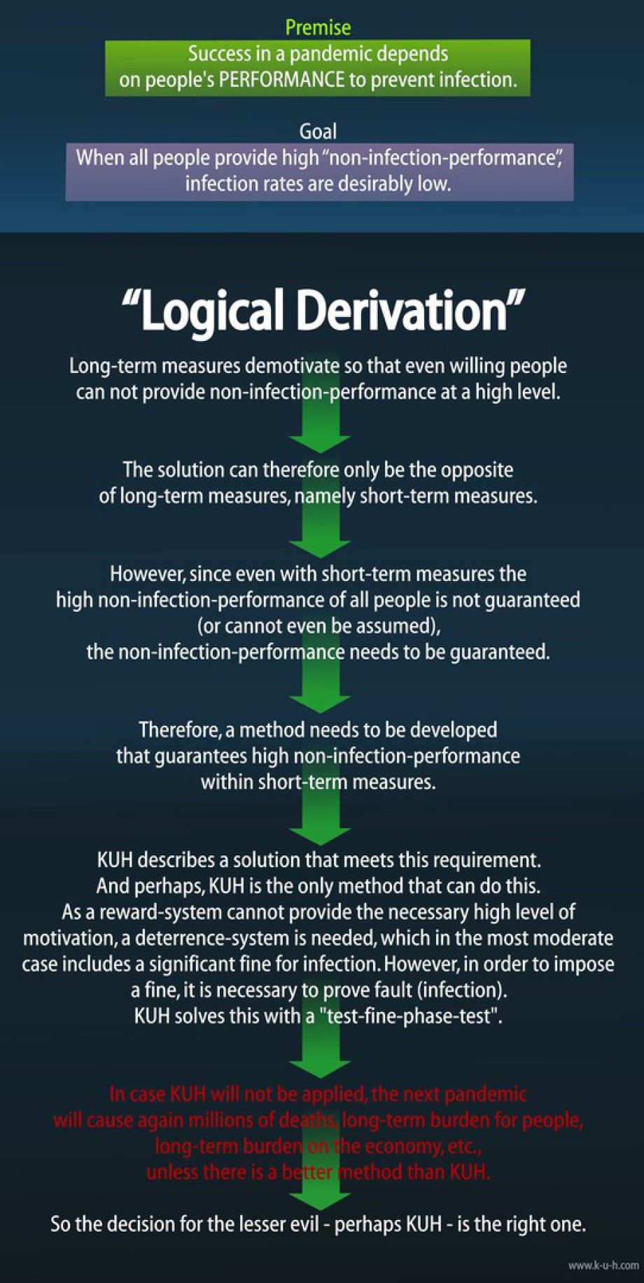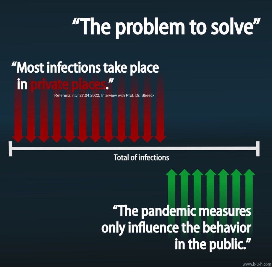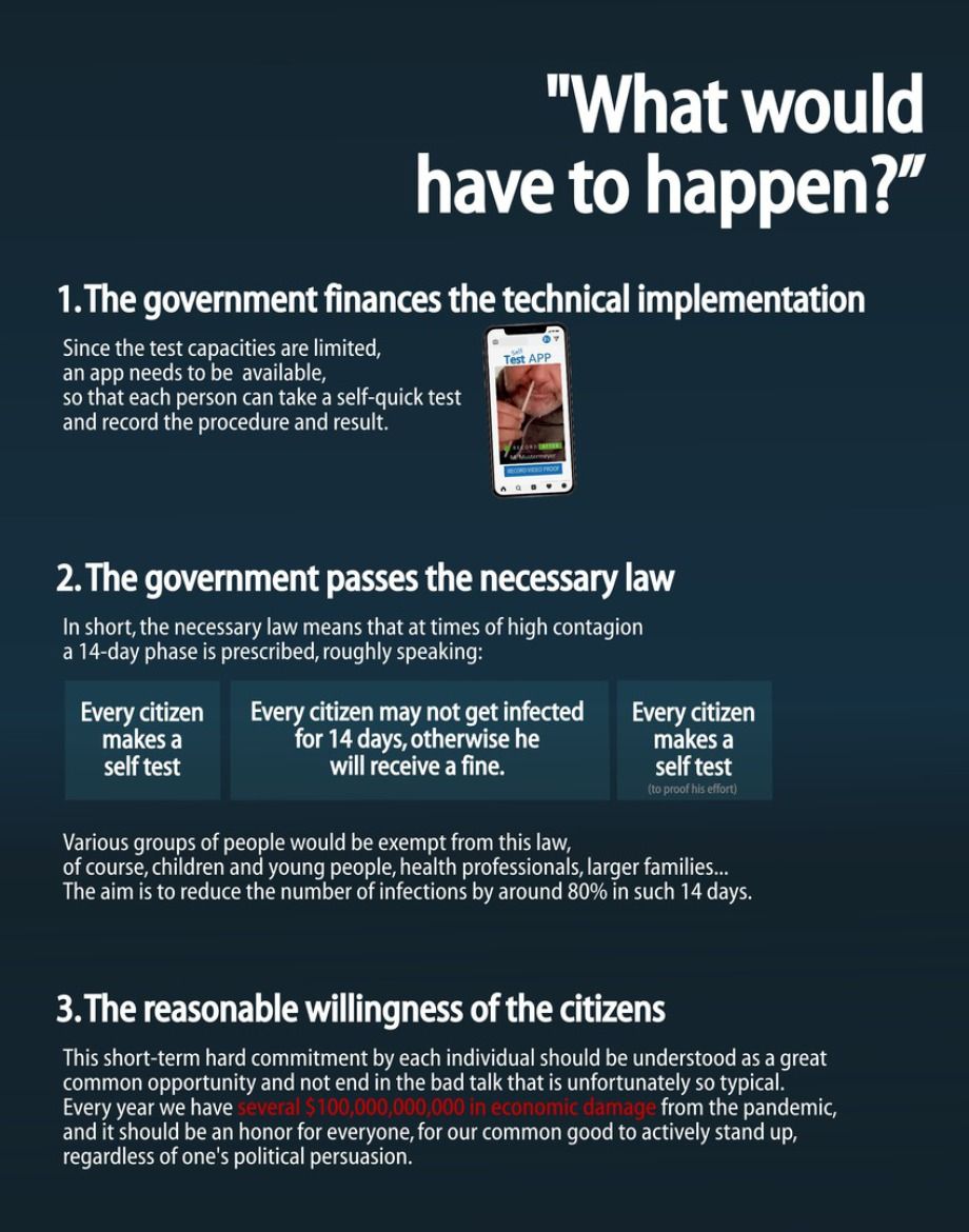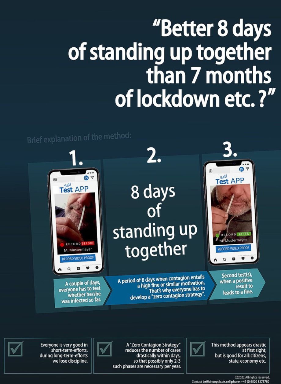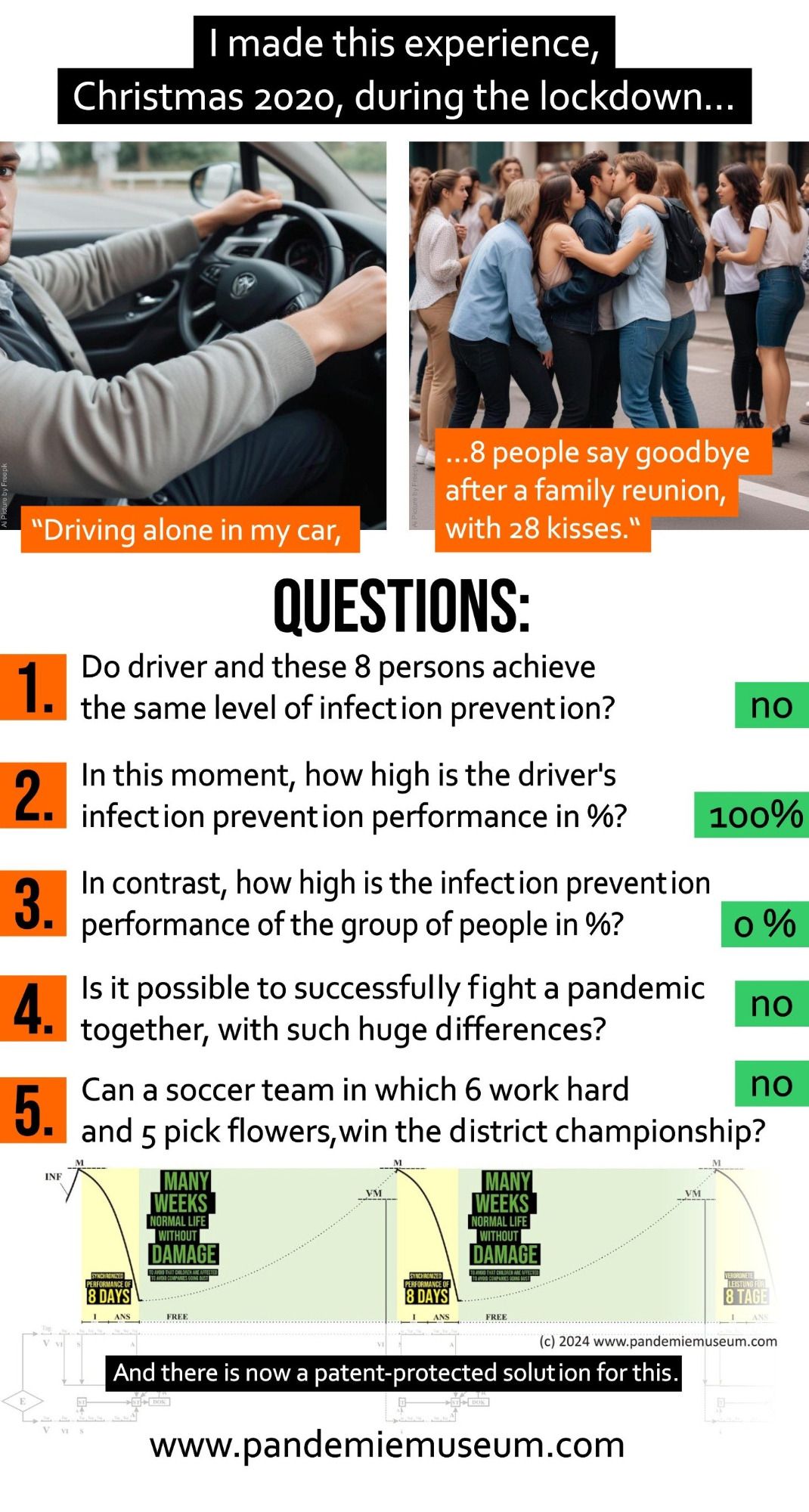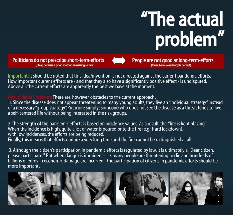 The very short description: People use only 40% of their possible infection prevention performance. Through a joint commitment, this is increased to 90% for 8 days, which then leads to 7-8 weeks of relaxed life, until such 8 days become necessary again.