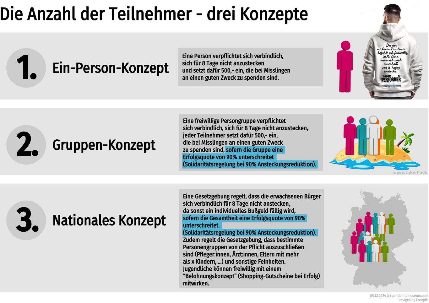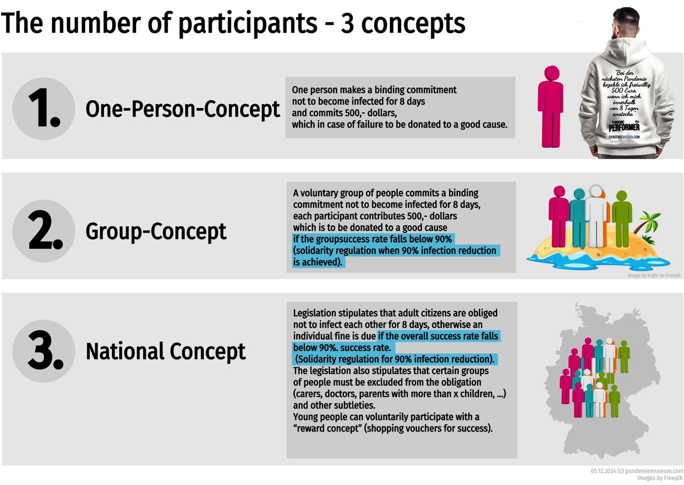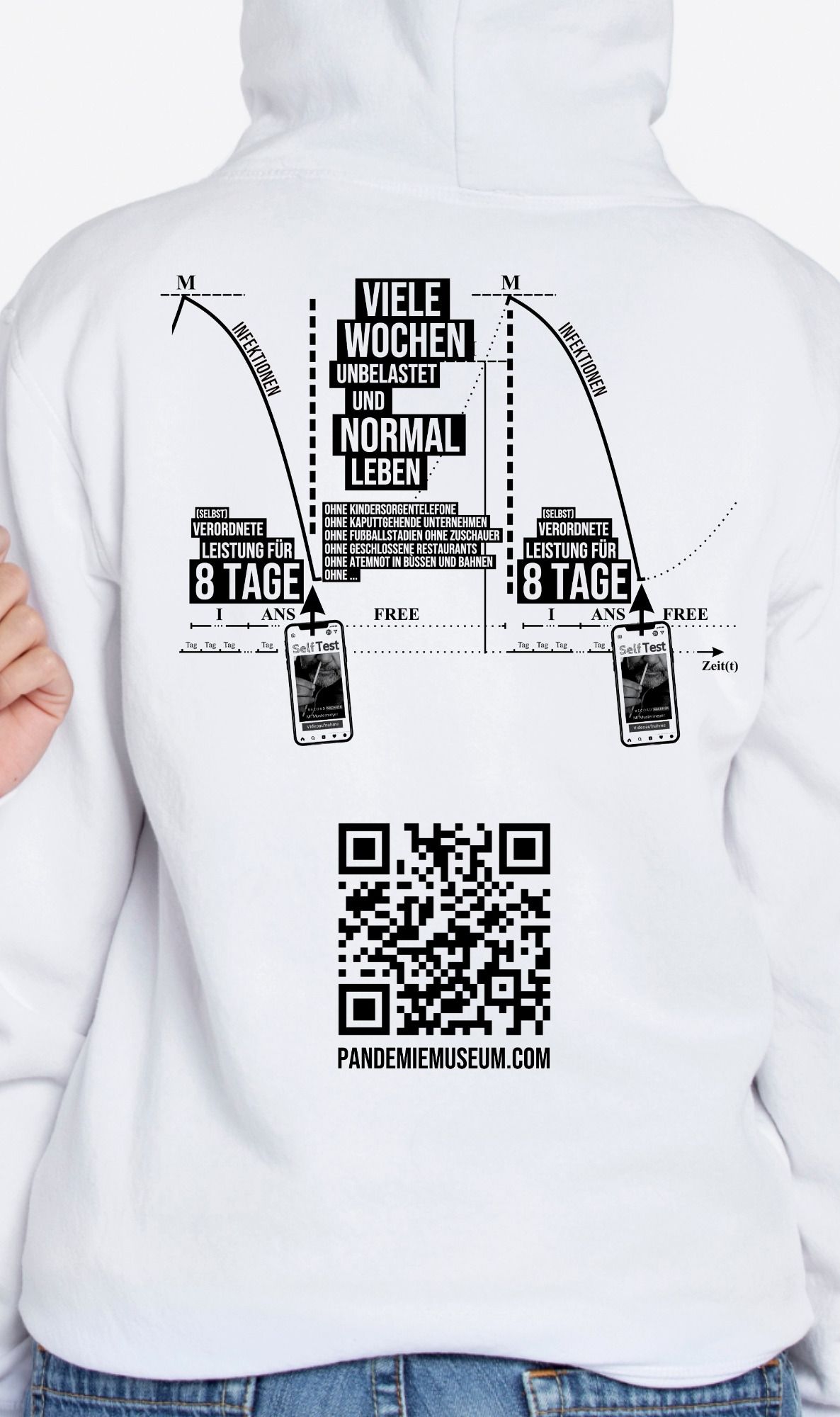 Nun stellt sich die Frage, was das Ganze soll, alleine mit 500,- Euro zu bürgen, sich 8 Tage nicht anzustecken. In der Form scheint es ja keine Auswirkung zu haben. Jedoch ist das "Ein-Person-Konzept" ein symbolischer Akt: Nämlich das zu tun, was 51 Millionen erwachsene Bürger eigentlich ebenso zeitgleich machen sollten. Wer diesen Hoodie trägt, steht für die Sache, entweder als jemand, der sich irrt, oder als jemand, der die Notwendigkeit und Tragweite des Konzepts verstanden hat. (siehe auch u.g. Grafik "Ein-Person-Konzept").