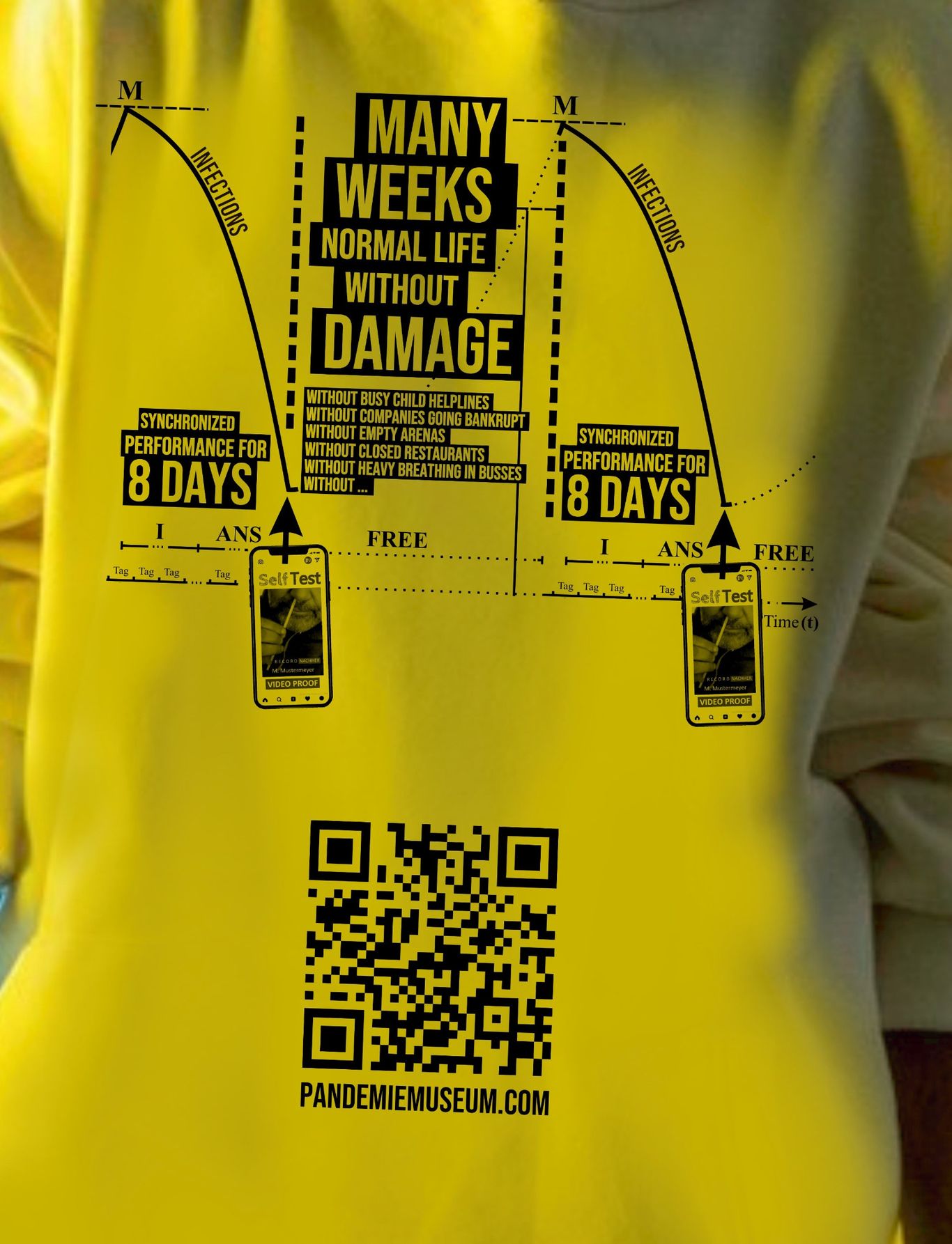 The question arises, what the whole thing is all about, vouching with 500 dollars alone, not getting infected for 8 days. It doesn't seem to have any effect if you act on your own. However, the “one-person concept” is a symbolic act: doing what 210 million adult citizens should actually do at the same time. Whoever wears this hoodie stands for the cause, either as someone who is wrong or as someone who has understood the necessity and scope of the concept. (see also the graphic “One-person concept” below).