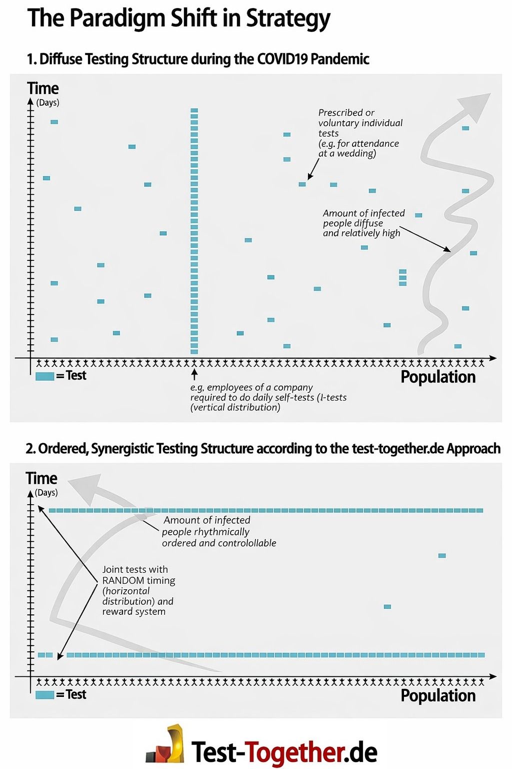 - This creates a database at headquarters which shows, for example, that 170,000 people are infected. However, the official case numbers suggest that only 100,000 would have been expected. The system tolerates this 70% excess. If, on the other hand, there had been 200,000 infections, a second test would be required for all infected participants after 6 days. (Statistically, this would mean that a “deliberate spreader” would only have a success rate of (8-6)/15=13%). Cheating is therefore unattractive and hardly ever occurs.