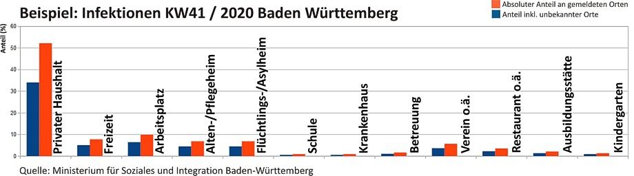 Aus Fig.3 geht hervor, dass aufgrund dieser statistischen Erhebung in Baden-Württemberg 52% der Ansteckungen im privaten Umfeld stattfanden (somit 48% öffentlich), bis dato ohne Verfügbarkeit von Impfstoffen.
