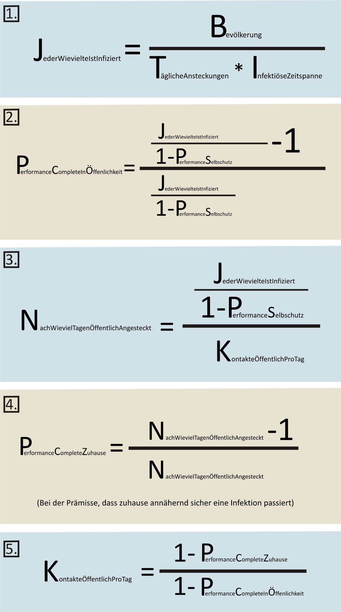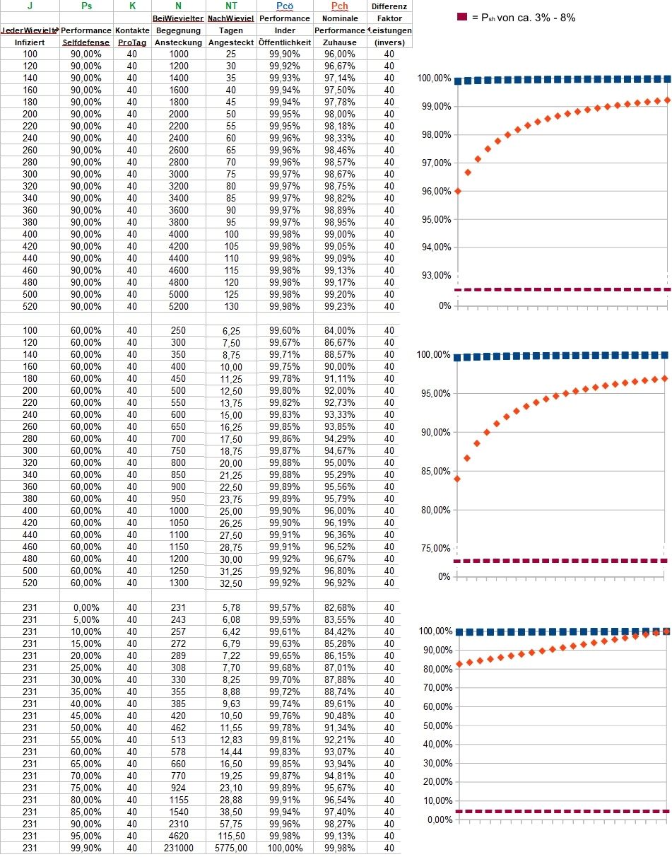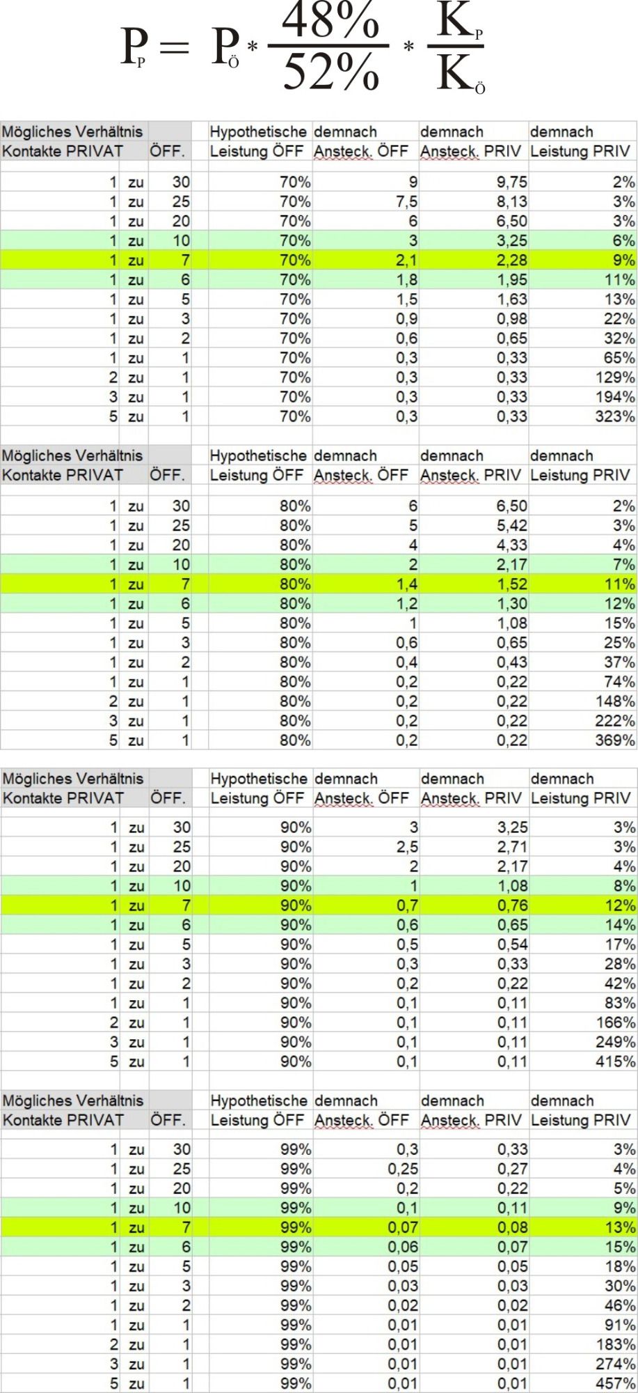 Logische Grundlage: Sofern die Menschen privat und öffentlich gleichviele Kontakte gehabt hätten, wäre auch ihre Leistung Pp und Pö nahezu gleich (Pp=48/52*Pö). Im Falle aber, dass die Menschen öffentlich deutlich mehr Kontakte gehabt hätten als privat, sänke die Leistung im Privaten erheblich entspr. dieser Formel, die auch in den Tabellen Anwendung findet:
