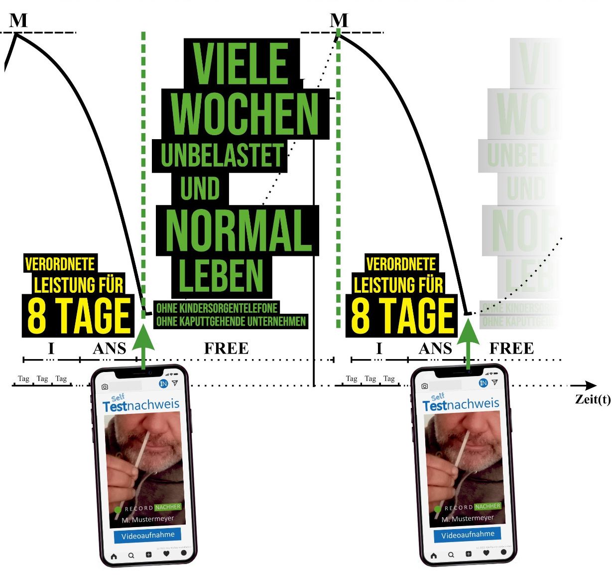 Fig. 6: Innerhalb eines Tages - oder kurzen - Zeitfensters erfolgt der erste Selbsttest aller Teilnehmer, woraufhin eine Periode folgt, in der das Sichanstecken ein Erschwernis – z.B. Bußgeld - mit sich bringt, sofern der zweite Selbsttest eine Veränderung im Antikörperstatus aufzeigt.