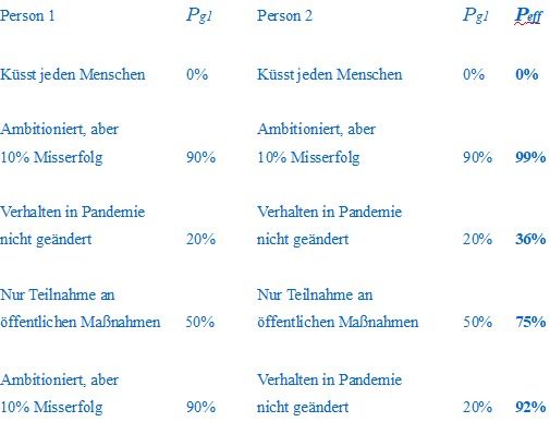 Den Fällen a) bis f) ist eine Ps zuzuordnen. Bei hoher Infektiosität ist bei a) eine verschwindend geringe Größenordnung von 3-10% anzunehmen. Daraus folgt, dass beim täglichen Kuss des Lebenspartners, welcher sich ja selbst in der Öffentlichkeit 58 Tagen im Mittel ansteckt, zuhause eine Pc von 57 / 58 = 98,3% .