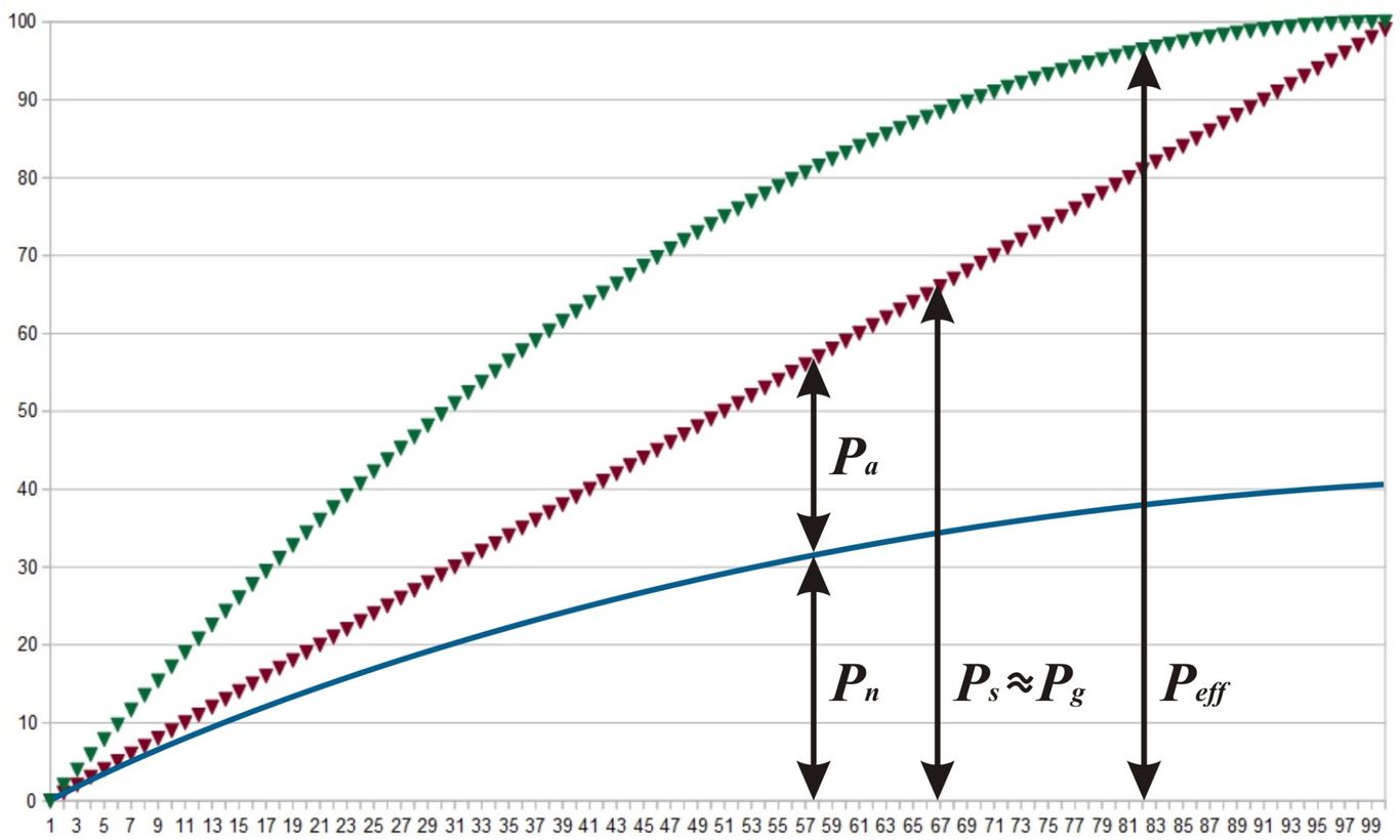 Die grüne Punktemenge zeigt, welche kumulierte Leistung sich ergibt, sofern jeweils zwei Personen gleicher Pg aufeinander treffen, theoretisch derart gerechnet, dass stochastisch aufeinanderfolgend ihre Pg wirkt, nach folgender Formel, ebenso für unterschiedliche Leistungsgrade geltend: