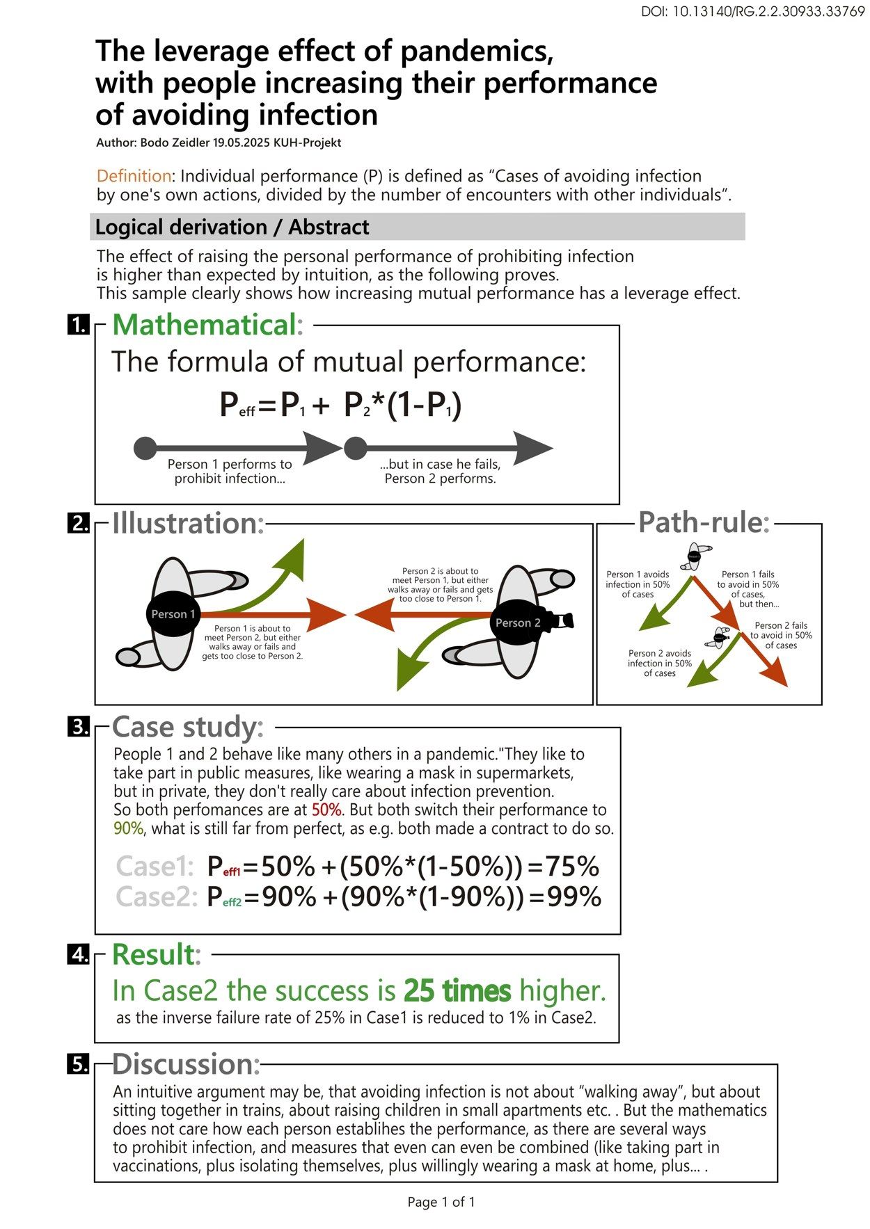 a) Es soll von einer kleinstmöglichen Bevölkerung ausgegangen werden, nämlich zwei Menschen. Beide seien hochmotiviert, mit jeweils einer angenommenen Pg von 90%, also einer kumulierten Leistung Peff von 99%. Beide vereinbaren über einen infektiösen Zeitraum von 7 Tagen [4], hinreichenden Abstand zu waren. Folglich versiegt innerhalb der Bevölkerung die Krankheit. Gleiches passiert, wenn einige Personen, wie z.B. drei so vorgehen. Bei einer Minimalbetrachtung erscheint also die Linderung einer Pandemie einfach.