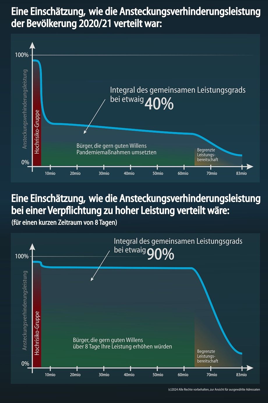 Denn jeder Mensch vollbringt während einer Pandemie permanent eine Ansteckungsverhinderungsleistung: Wer alleine Angeln geht, hat eine Leistung von 100%, wer in der Fußgängerzone jeden Mensch abküsst, eine von 0%. Wenn über eine Zeitdauer von 8 Tagen (ansteckbare Zeit) alle Menschen gleichzeitig eine Leistung von 100% erbrächten, wäre der Ansteckungsstand (fast) komplett dezimiert. Die Komplexität der Gesellschaft legt jedoch nahe, dass ein gemeinsames, günstiges Verhalten nicht zu erwarten ist. Meine wissenschaftlich formulierte Arbeit „Theorie einer leistungsorientierten Strategie für zukünftige Pandemien“ kommt u.a. zu zwei wichtigen Ergebnissen: